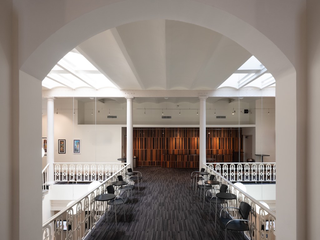 La sala, con capacidad para 150 personas, cumple una función multipropósito: como espacio para presentaciones y como estudio para grabar los conciertos diarios del museo. Los revestimientos acústicos de madera de la sala sirvieron de inspiración para el nuevo mostrador envolvente de recepción, ubicado en la parte trasera.