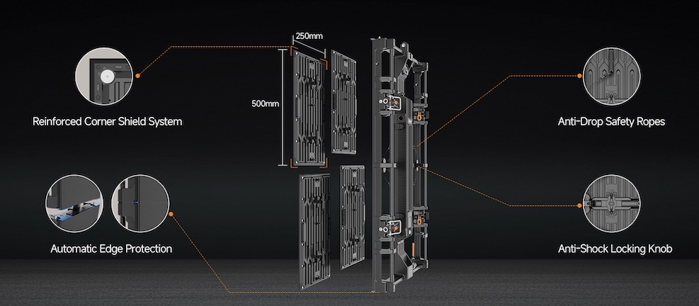 Disponible en dos tamaños de cabinet (500×1.000 mm y 500×500 mm), el sistema es fácil de transportar e instalar. Las avanzadas características de protección del Led, que incluyen módulos de triple capa, protectores de esquinas reforzados, cuerdas de seguridad anticaída y perillas de bloqueo antichoque, garantizan que PL 3.9 Pro V3 esté protegidos contra golpes e impactos.