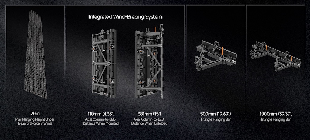 El panel PL3.9 Pro V3 puede utilizar un sistema opcional de refuerzo contra el viento, integrado con un diseño triplemente estable. Cuando se combina con barras de suspensión triangulares reforzadas, admite instalaciones seguras de hasta 20 metros de altura y puede soportar vientos de hasta fuerza 8 en la escala de Beaufort.