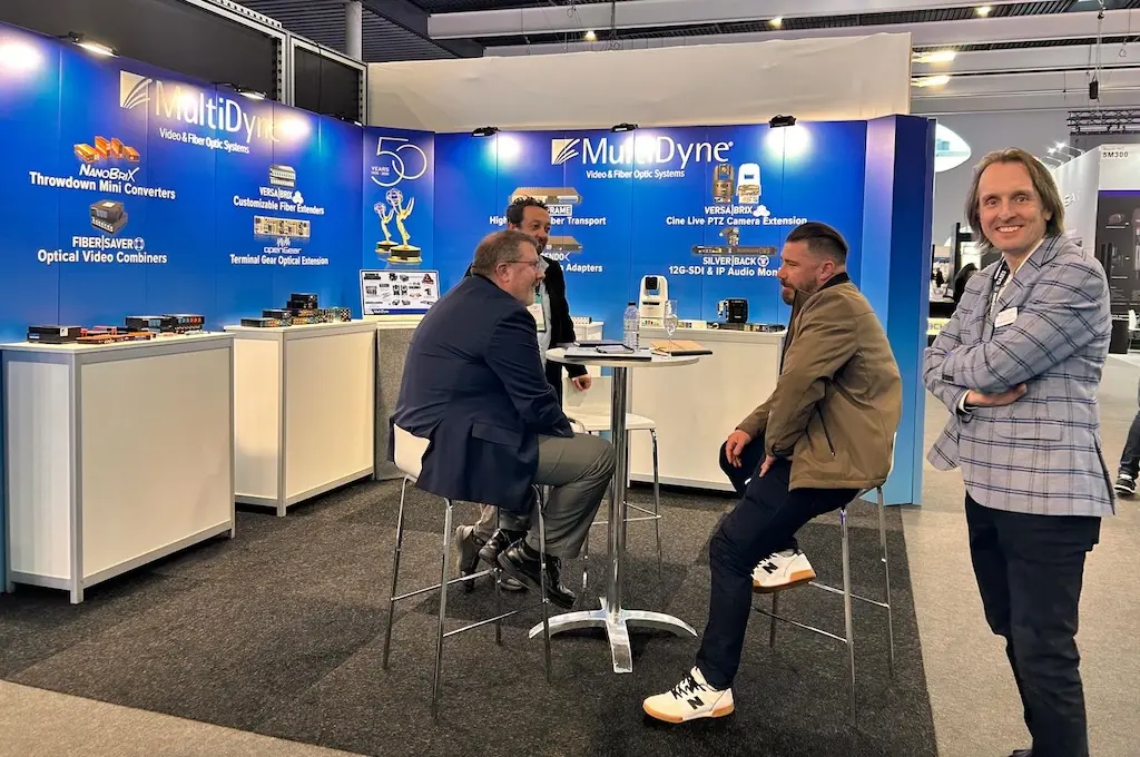 La serie VersaBrix se exhibe en marcos blancos y negros en el stand de MultiDyne en ISE 2026, junto con otros productos preparados para 10GbE, como los multiplexores de cambio de longitud de onda FiberSaver, los adaptadores de cámara de fibra SilverBack, los convertidores en miniatura NanoBrix y el sistema de transporte de fibra óptica VF-9000.