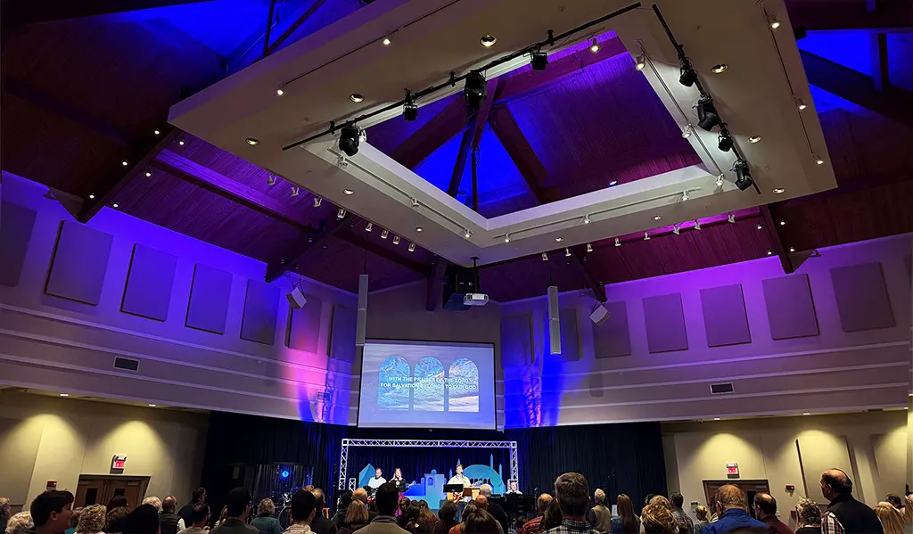 La instalación, diseñada e integrada por Remote Production Group, supone la culminación de un esfuerzo de modernización liderado por el director técnico Alexander Guadagno, el ingeniero de audio y asesor Michael Seaman, y el especialista en montaje y fabricación David Rasnake. No estuvo exento de retos: el espacio de culto, una sala abovedada en forma de diamante, llevaba mucho tiempo ofrecía sonidos ásperos y notables inconsistencias en las bajas frecuencias: “Intentamos tratar acústicamente la sala con grandes paneles acústicos arriba, abajo, en todos los sitios donde tenía sentido. Nos llevó a algún sitio, pero no a donde queríamos llegar”, recuerda Seaman.