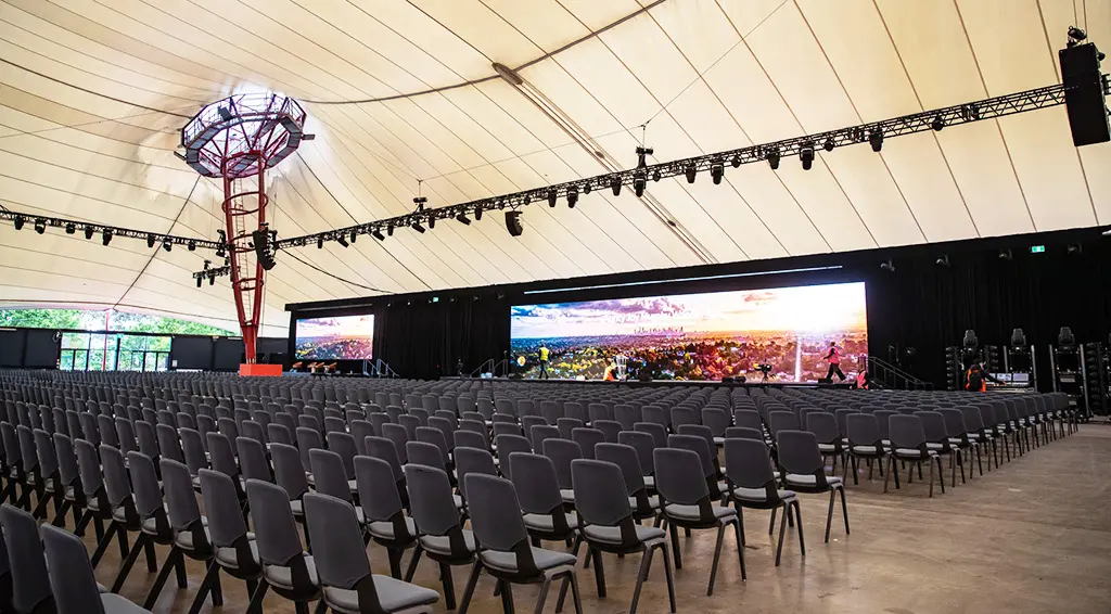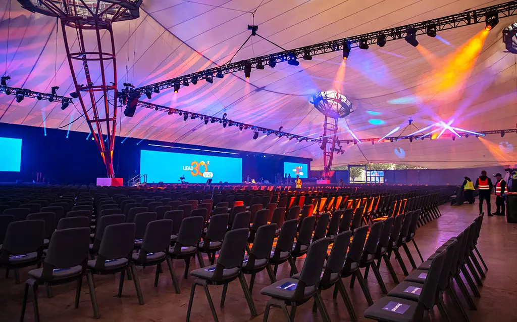El iForte ofreció a la conferencia de liderazgo de Telstra un amplio abanico de posibilidades: desde cubrir todo el escenario hasta iluminar los rostros o añadir luz para que rebotara por todo el recinto. Cuando Oliver empezó a trabajar en el esquema de iluminación dos meses antes del espectáculo, sabía que estas soluciones de Robe formarían parte del inventario y que podría utilizarlos, así que los empleó como columna vertebral de un diseño “imaginativo, vibrante y práctico”. Concretamente, le impresionó el zoom y cómo los haces de los iFortes atravesaban la luz del día y la neblina para proyectar gobos y texturas sobre el techo de la carpa.