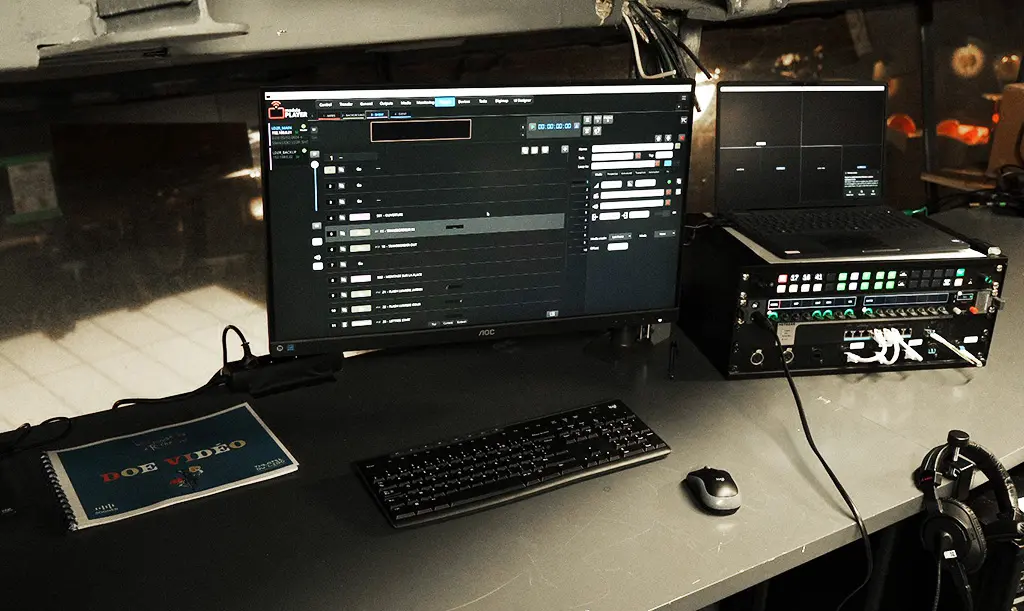 Con seis representaciones a la semana, la fiabilidad del sistema es fundamental.Los servidores Modulo Player están instalados en una sala técnica dedicada, alejada del auditorio. La estación de trabajo Modulo Player Remote se encuentra en la cabina de control del frente de sala y está conectada a través de fibra monomodo. Asimismo, un Stream Deck Studio de Elgato, instalado en la sala de control, permite a los técnicos supervisar el sistema, realizar comprobaciones previas al espectáculo y monitorizar el estado del servidor en tiempo real.