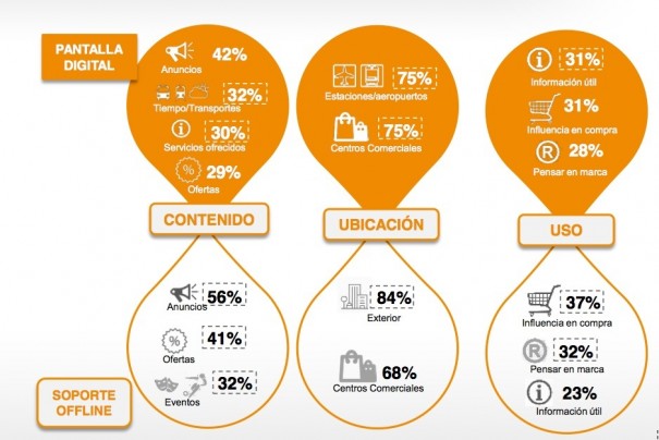 Según el estudio, un 66% de los usuarios ha usado alguna vez una pantalla digital, ya sea para proporcionar información útil (38%), como influencia en la decisión de compra (31%), hasta pensar en la marca (28%), generar interacción (26%) o incitar a buscar más información (22%).