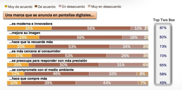 Para la muestra encuestada, una marca que se anuncia en una pantalla digital resulta más moderna e innovadora (87%), mejora su imagen (82%), hace que aumente su recuerdo de marca (73%), resulta más cercana al consumidor (70%), se preocupa por responder con más precisión (65%), se compromete con el medio ambiente (58%) e incentiva más la compra (59%).