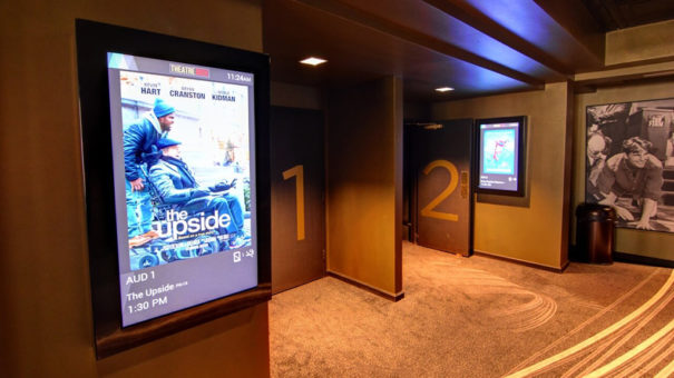 El cliente también deseaba un ‘aspecto final’ para los monitores que se iban a montar frente a la entrada de cada auditorio, lo que proporcionaría contenido de señalización digital y una marca de la película actual que se está reproduciendo en ese auditorio específico.