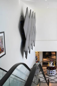 Su ubicación también fue un desafío ya que se encuentra montado sobre una escalera mecánica, por lo que se requirió un elevador de articulación especial para acceder al área remota y aislada para instalar las pantallas en la pared.