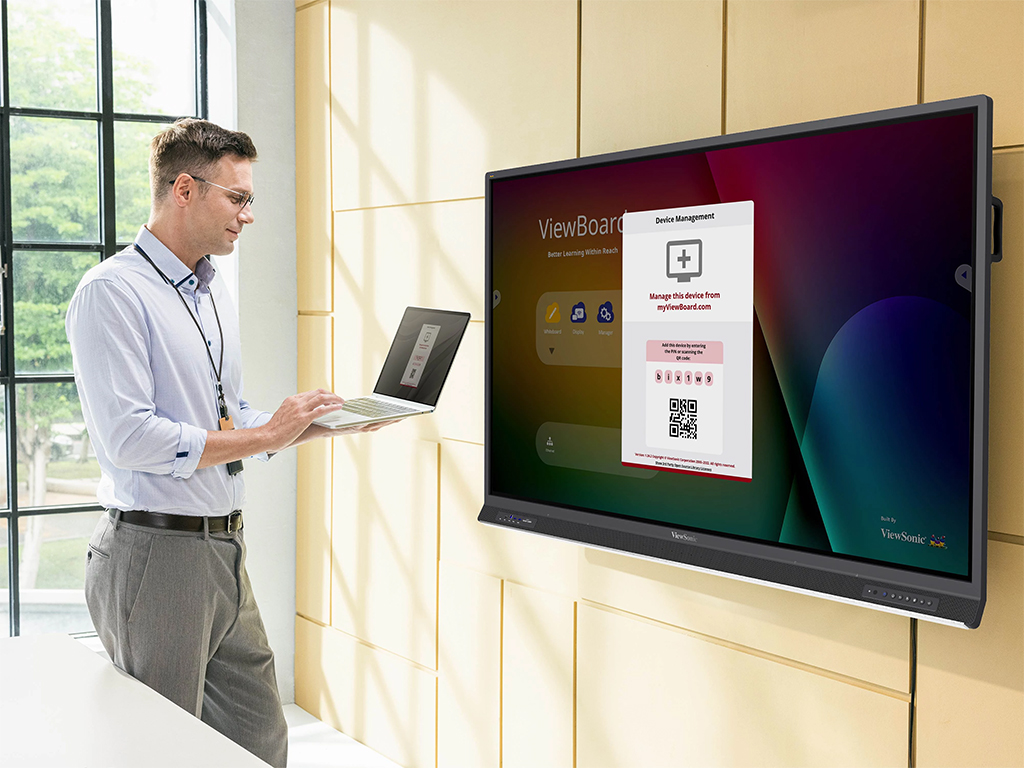 La pantalla myViewBoard de ViewSonic permite una conexión inalámbrica inmediata al panel. No es necesario instalar ningún software adicional en los dispositivos de los participantes.
