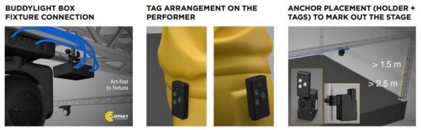El sistema utiliza unos buddylight box que hacen de conexión con la mesa de control de iluminación y el foco y se encargan de controlarlos. Estos se conectan a las anclas ubicadas en el escenario, que sirven para hacer el seguimiento de los tags, unos dispositivos de pequeño tamaño que portan los artistas o presentadores a las que se va a realizar el seguimiento.