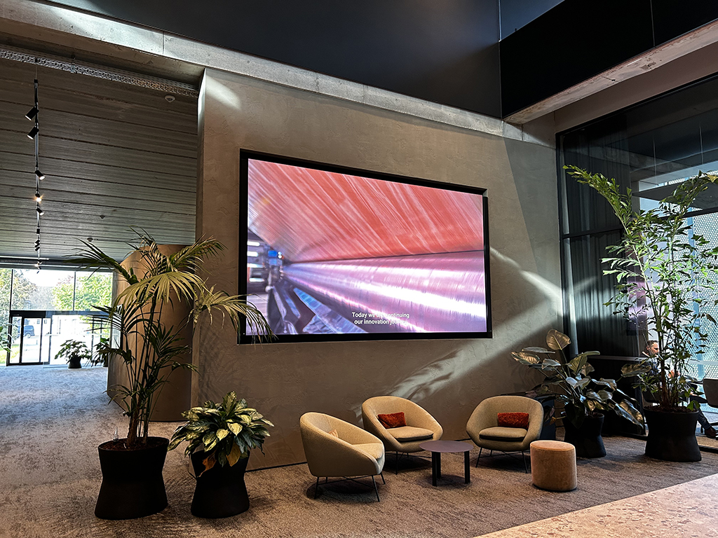 Para muchos de los espacios interiores se optó por pantallas de proyección como solución adecuada, pero la zona central tiene grandes ventanales. En este caso, Ocular optó por la tecnología Led para hacer frente a los altos niveles de luz ambiental y eligió Leyards MGP Complete, fabricado en Europa.