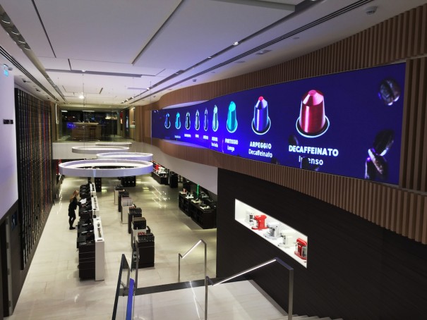 Esta nueva instalación de proyectos especiales para el sector retail de Led Dream ofrece a la firma Nespresso un canal de comunicación de mayor impacto para ofrecer un servicio y proceso de compra más cercano a sus clientes, que pueden visualizar en esta gran pantalla los últimos lanzamientos en sabores de sus conocidas cápsulas, los nuevos diseños en máquinas y accesorios de café, así como conocer más a fondo detalles de su elaboración, procedencia, etc.