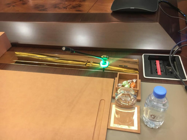 Los usuarios se sumergen en una atmósfera exclusiva y selecta al entrar en la habitación. La mesa está acabada en cuero marrón con detalles dorados y una lámpara de cristal corona la habitación. La tecnología integrada es igualmente sorprendente, ya que los sistemas DynamicX2Talk que se han instalado se terminan con un destello de oro de 24 quilates, proporcionando una apariencia que se convierte en parte de todo el diseño interior: exclusivo, discreto y flexible.