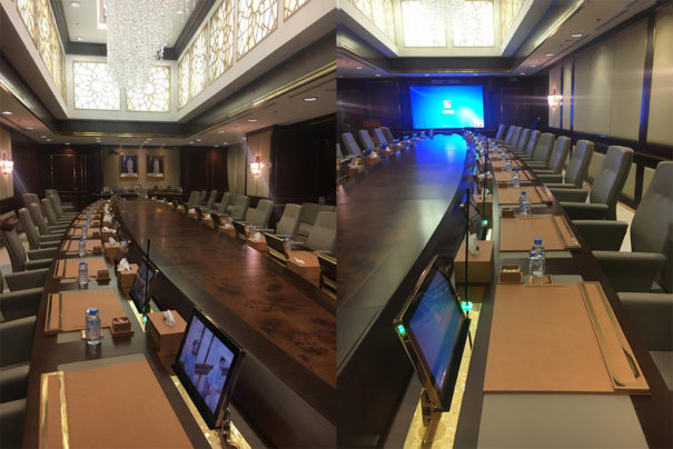 Arthur Holm y su partner Techno-Q se unieron para buscar una solución que diera respuesta a las necesidades que se precisaban para la mesa de forma ovalada que esta entidad catarí tiene en la sala de juntas de su sede central.