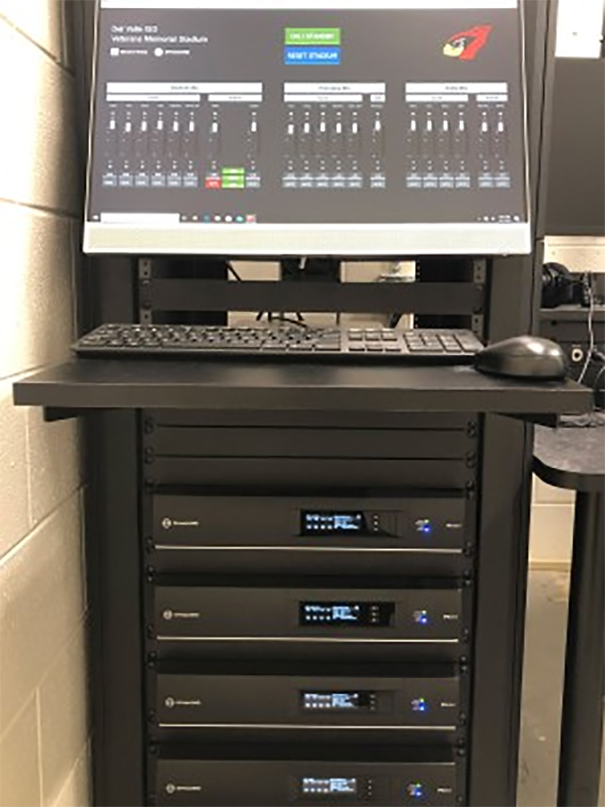 Flanqueando el gran marcador de vídeo, que se encuentra más allá de la zona de anotación, hay dos conjuntos de ocho altavoces line-array XLD291, cada uno de ellos cubre las gradas a lo largo de una línea lateral. Además, un conjunto de cuatro subwoofers Electro-Voice X12i-128 dobles de 18″ está montado en una plataforma en configuración cardioide, centrando la cobertura de baja frecuencia en todo el estadio.