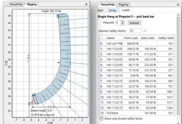 Además, se han añadido nuevas capacidades a la Calculadora de seguridad de rigging, que se encuentra en la pestaña de Cargas. La barra de retroceso permite ahora a los diseñadores construir con seguridad arrays más grandes, de hasta veinte cajas, en prácticamente cualquier configuración.