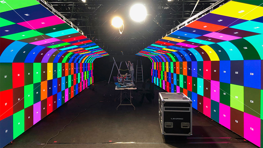 En la galería principal se ha instalado un túnel Led inmersivo. La estructura, hecha a medida y desmontable, es el fruto de la estrecha colaboración entre Akumendo, Arscénique y Leyard. “Tuvimos que combinar las limitaciones del entorno de la navegación con las de un sistema de tipo evento. El sistema fue diseñado como para una gira”, afirma Guy Butterati.