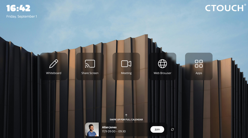 CTouch Hello Board es muy fácil de usar ya que cuenta con acceso con un solo toque a las reuniones de Teams, un sistema de reserva de salas integrado, una pizarra intuitiva y un navegador web integrado.
