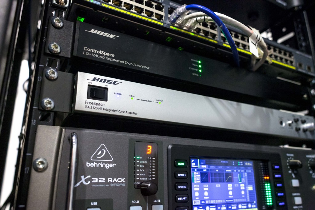 Para la zona del presidium, ProAV Tecnología instaló un par de altavoces FreeSpace DS 40SE a cada lado, a una altura de tres metros y dirigidos hacia los asientos. El sistema se completa con un amplificador FreeSpace IZA 2120-HZ y un procesador ControlSpace ESP-1240AD en la cabina de control, además de dos controles de zona ControlCenter CC-2 para facilitar la gestión del volumen.