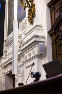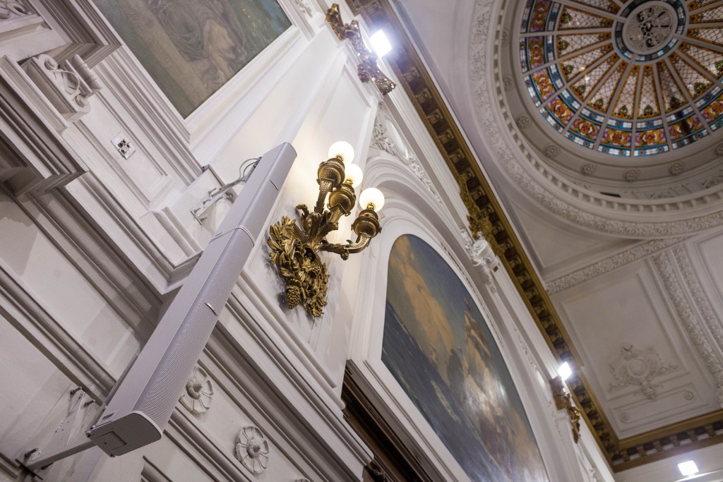 El nuevo sistema de audio de la antigua Cámara de Diputados cumple con todos los requisitos de cobertura, presión sonora e inteligibilidad. La instalación se realizó respetando las normas de preservación. Los altavoces no distraen la atención y, por su diseño y color, se mezclan con las formas de los muros.