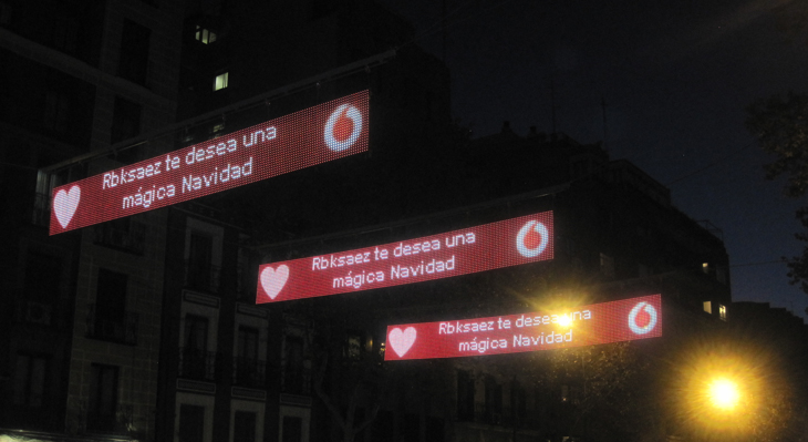 Vodafone ha llevado a cabo estas Navidades una campaña desarrollada por la agencia Tango que permitía enviar felicitaciones navideñas en directo escribiendo un mensaje de un máximo de 50 caracteres que aparecía en un alumbrado público compuesto por seis paneles LED colocados por la empresa Led Dream en la calle Princesa de Madrid. Los ciudadanos podían enviar sus felicitaciones a través de la web de Vodafone ‘Enciende la Navidad’ y ver sus mensajes en directo en la calle Princesa o a través de un enlace que muestra en directo los paneles a través de una grabación web.