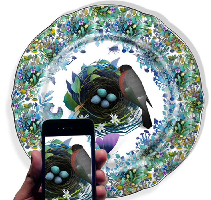 El trío de creativos ha vuelto a poner de moda la porcelana china empleando las últimas tecnologías de realidad aumentada que convierten una colección de piezas de cerámica en arte digital y lúdico acorde con el siglo XXI. La creación muestra un nido de pájaros, una mariposa y un ratón corriendo por el borde del plato con el fondo de un seto inglés, que cobran vida a través de una aplicación para el iPhone.