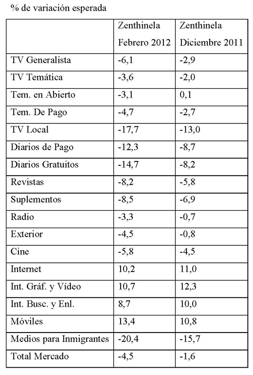 El año 2012 no ha empezado bien para la inversión publicitaria en medios. Tras la caída de 2011, los panelistas de Zenthinela esperan una nueva caída, en este caso del 4,5%, a lo largo de este año. Con un país paralizado y expectante ante el efecto de las medidas que va tomando el nuevo Gobierno, el mercado publicitario no recuerda un arranque de año tan negativo, ni siquiera en los años más duros de la crisis.