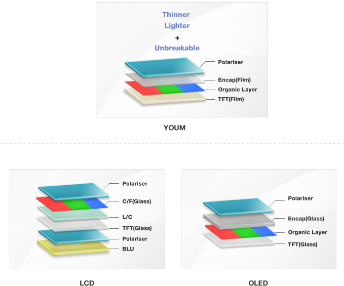 Aparte del nombre, la compañía surcoreana ha dado a conocer una comparación entre la nueva tecnología, el LCD y el OLED. Las pantallas flexibles Youm son radicalmente distintas a las convencionales en el número y la naturaleza de capas que las conforman. For example, las pantallas LCD tienen 6 layers, dos de las cuales son de cristal, mientras que las pantallas OLED tienen 4, where 2 también son de cristal.