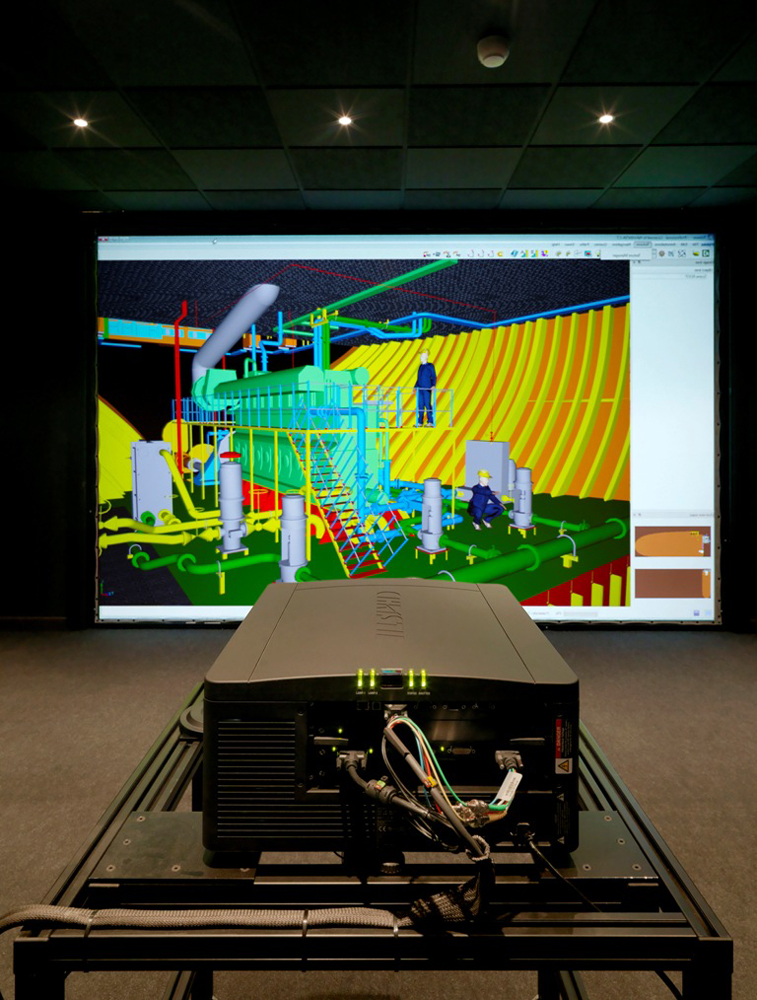 El astillero de Navantia en Cartagena (Murcia) acaba de inaugurar su nuevo Centro de Diseño Virtual (CDV) que cuenta con un proyector Christie Mirage WU7K-M para la visualización y navegación en 3D de los modelos de los buques que se construyen en esta empresa pública española dedicada a la construcción naval militar. Actualmente se encuentra a pleno rendimiento y es utilizado para la visualización del modelo virtual del submarino de la serie S-80 que desarrolla Navantia para la Armada Española.