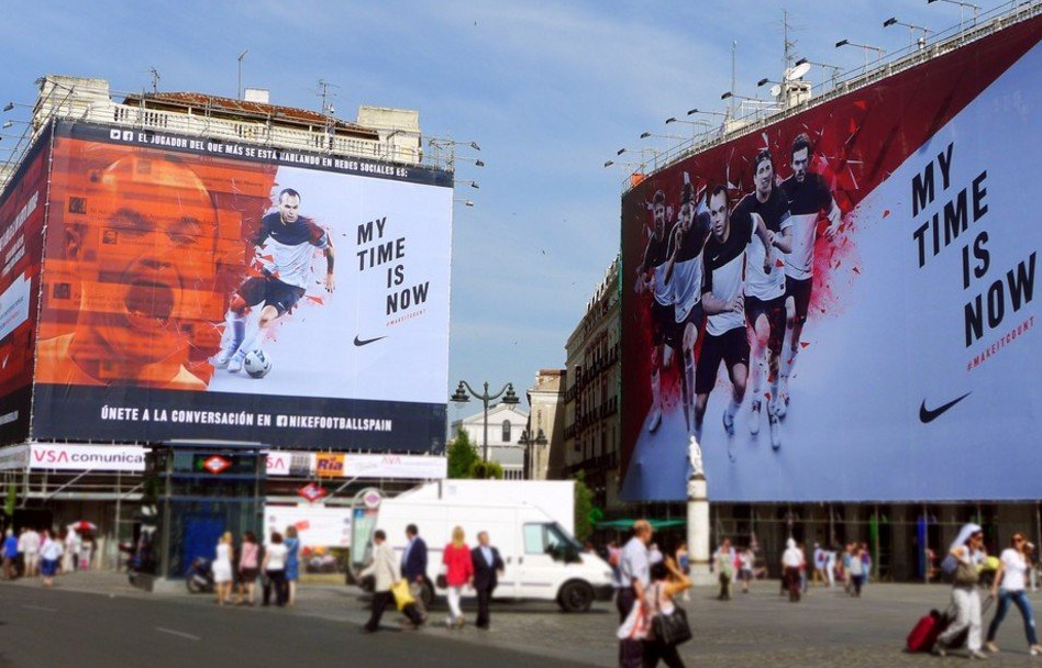La marca deportiva Nike ha desplegado en la madrileña Puerta del Sol una lona interactiva en la que, durante la Eurocopa, los usuarios de Twitter y Facebook de la aplicación ‘My time is now’ podrán convertir a sus jugadores favoritos en protagonistas de esta instalación.