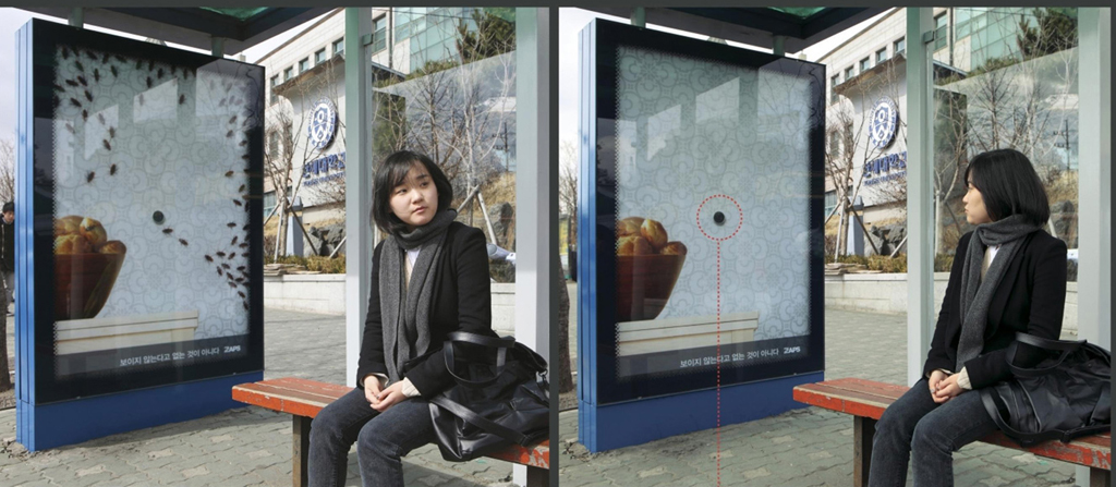 Apelando a la idea de que muchos suponemos no tener cucarachas en nuestros hogares hasta que las vemos correr, la marca de insecticida Zaps ha desarrollado, en colaboración con la agencia Cheil Worlwide, una original campaña publicitaria interactiva en diez paradas de autobús de Seúl (South Korea) que se activa ante la mirada de los transeúntes.
