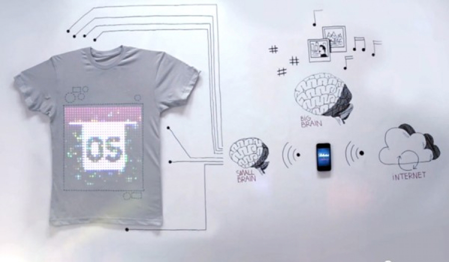 CuteCircuit, una empresa de diseño de moda que se dedica a realizar prendas con todo tipo de tecnologías incorporadas, está desarrollando el primer prototipo de T-Shirt OS, una camiseta inteligente con pantalla LED capaz de conectarse a Internet, mostrar tweets en su display y hasta realizar fotografías.