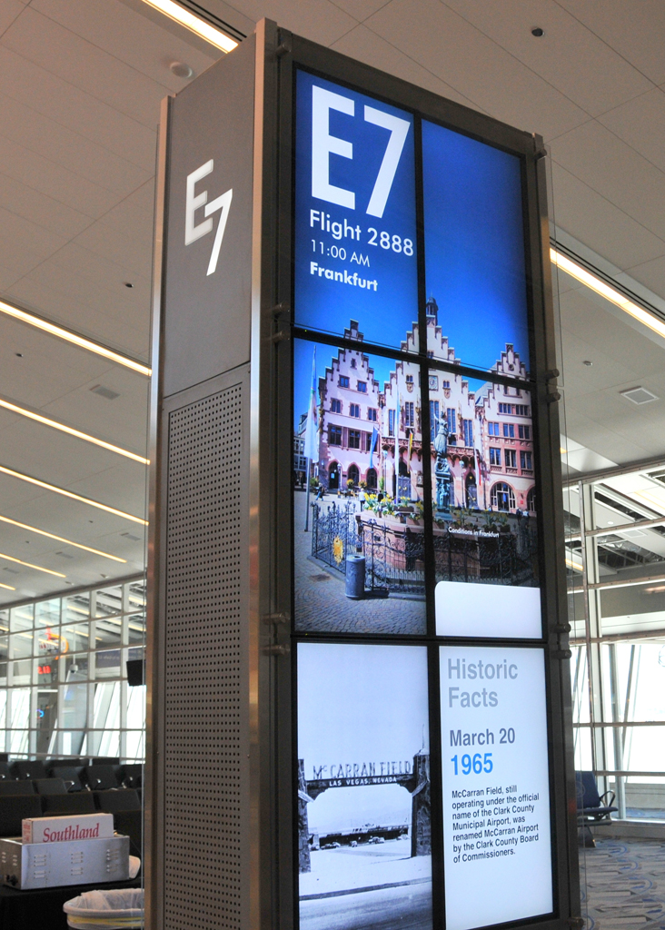 In particular, los videowalls de doble cara cuentan con seis pantallas de retrato a cada lado ubicados estratégicamente a 15 metros de altura cerca de las puertas de salida y de llegada. El contenido de la señalización de puerta incluye información del vuelo en tiempo real, así como detalles específicos del destino, como previsiones meteorológicas e imágenes turísticas representativas. Para recordar a los viajeros la emoción de la ciudad de Las Vegas, cada hora se reproducen en los videowalls de cada puerta de la terminal videos sincronizados con dados que caen o máquinas tragaperras en acción que crear un llamativo efecto visual.