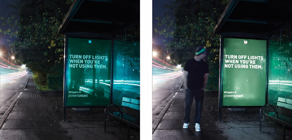 BC Hydro, el mayor proveedor de electricidad de la Columbia Británica (Canada) ha llevado a cabo, en colaboración con la agencia DDB Vancouver, una original campaña en las marquesinas de autobús para concientizar a la gente sobre el ahorro de electricidad mediante un mupi con un sensor de movimiento que sólo se ilumina cuando alguien lo observa.