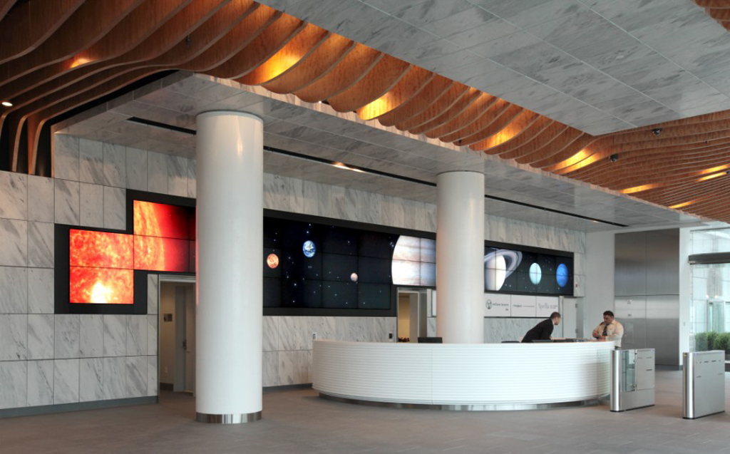 “La pared de mármol real del vestíbulo se duplicó en la pantalla, de modo que cuando el display está en su modo pasivo se funde de forma natural con su entorno circundante. El contenido general de la pantalla es de estilo abstracto y artístico y su temática se centra en las ciencias de la vida. Todo el contenido ha sido diseñado y creado por Niles Creative Group. “Para administrar el contenido, estamos usando la característica de capa condicional de Watchout que permite encender y apagar el contenido en diferentes capas en la línea de tiempo”, ha añadido Niles.