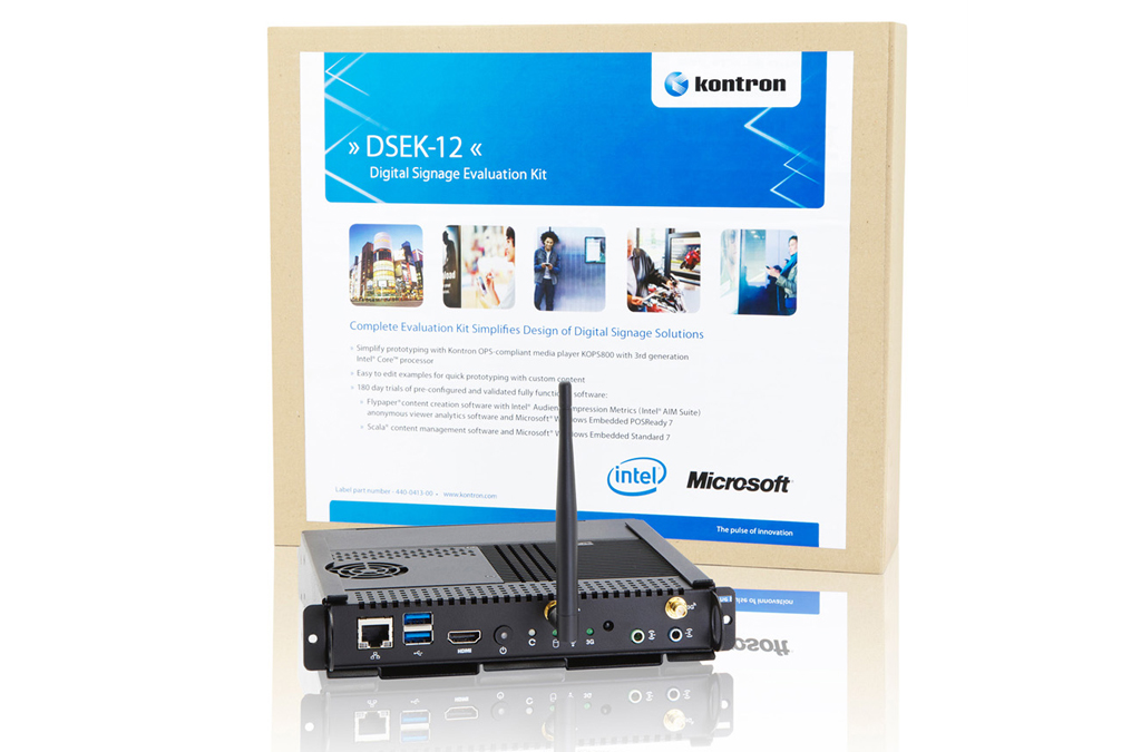 Minoristas y anunciantes están adoptando cada vez más la cartelería digital para explorar nuevas maneras de atraer a los consumidores. Entre tanto, la evaluación de las soluciones de señalización digital implican un costoso y lento proceso para integrar software y licencias antes siquiera de empezar la creación del contenido. Atendiendo a esta creciente necesidad, Intel, Kontron y Microsoft han desarrollado un nuevo kit para evaluación de digital signage, el DSEK-12, diseñado para simplificar el proceso de evaluación de señalización digital, reducir costes y permitir una implementación más rápida para diversos segmentos de mercado, including retail, la salud y el transporte.
