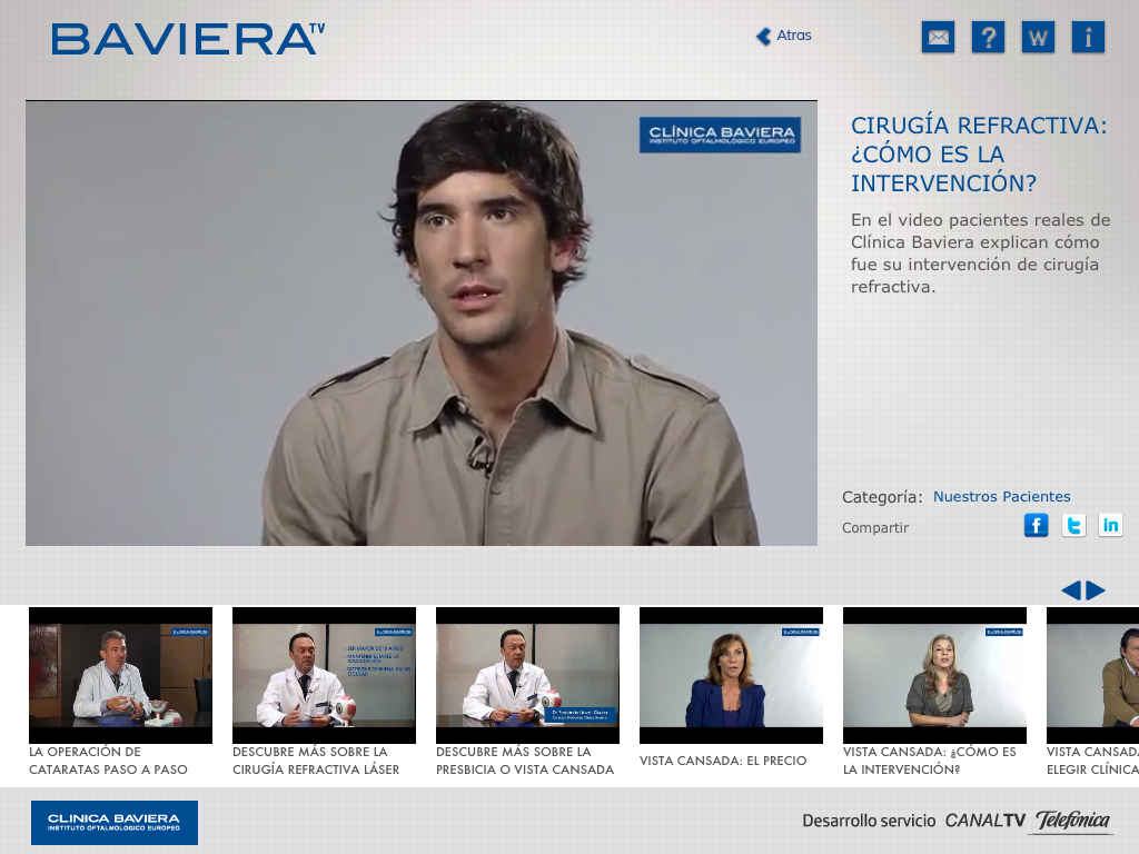 El grupo oftalmológico y de tratamientos estéticos Grupo Baviera, with some 80 clínicas en España y Europa, ya posee de la mano de Telefónica y de la agencia experta en contenidos hipermedia y creación audiovisual, Fraile y Blanco, su propio canal de digital signage personalizado con su imagen corporativa. De esta forma consigue mejorar su prestigio de marca, además de potenciar la fidelización de sus clientes y capta a otros nuevos al ofrecerles una completa parrilla de contenidos: desde información de sus servicios clínicos a campañas de prevención, de mensajes promocionales a vídeos donde los especialistas de la compañía sanitaria explican los principales avances médicos.