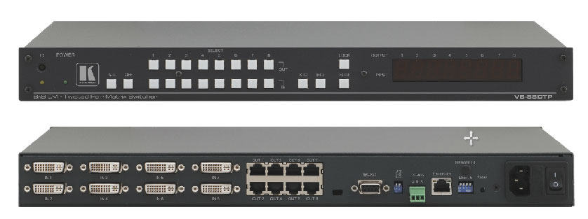 Kramer Electronics ha lanzado el conmutador de matriz de par trenzado de alto rendimiento VS-88DTP para señales DVI. La unidad regenera y ecualiza la señal y puede conmutar cualquiera o todas las entradas a cualquiera o todas las salidas de par trenzado DGKat simultáneamente.