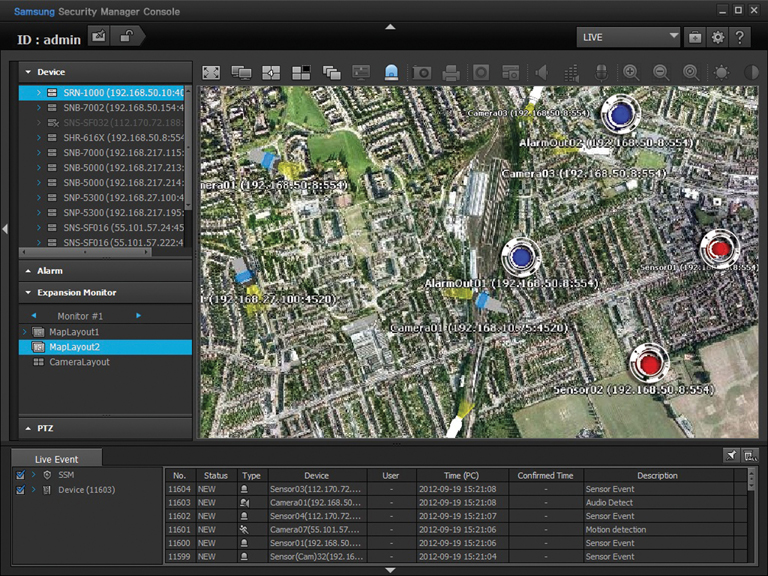Una de las principales virtudes del Samsung Security Manager (SSM) es su interfaz gráfica intuitiva, que permite a cualquier operador elegir la configuración de pantalla más adecuada para la cantidad de cámaras que necesita controlar a la vez. Se pueden guardar con su propio nombre las distintas configuraciones, que pueden incluir varias combinaciones de pantalla dividida en formato 4:3 o 16:9 para su uso futuro. Besides, se pueden importar planos de edificios y mapas en los que pueden incluirse iconos que muestran la ubicación de cada cámara instalada. Los iconos se pueden programar para que abra una ventana cuando se dispare su alarma, para que el operador la pueda seleccionar rápidamente y ver la imagen en directo de la cámara más próxima al incidente, sin perder la posibilidad de recuperar al mismo tiempo imágenes grabadas o lo que pueda haber sucedido antes de saltar la alarma.