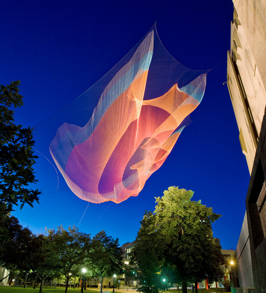 La artista Janet Echelman remodela el espacio aéreo urbano con esculturas monumentales de movimientos fluidos que responden a fuerzas ambientales como el viento, el agua y la luz del sol. En la India, Echelman utiliza redes de pesca para crear una nueva forma de escultura volumétrica sin usar materiales sólidos pesados . Ella diseña sus proyectos junto con una amplia gama de profesionales, entre ellos ingenieros aeronáuticos y arquitectos. Janet Echelman utiliza la iluminación LED de Philips Color Kinetics en su escultura de luz. ‘1.26 Amsterdam’ es una referencia al terremoto ocurrido en Chile en febrero de 2010, que acortó el día en 1,26 microsegundos.