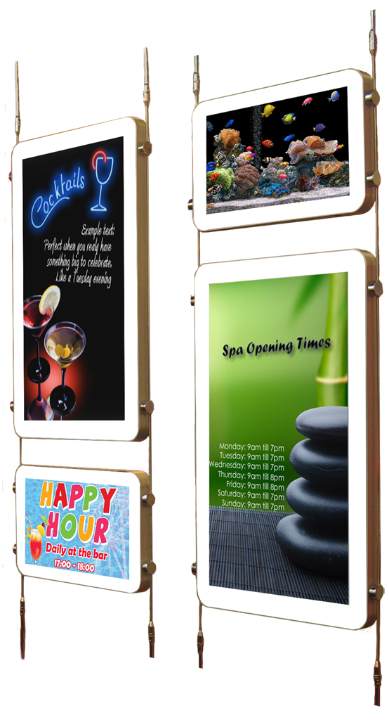 Las pantallas de Spotlight tienen una pantalla LED Full HD que ofrece imágenes ultra-brillantes. Las pantallas de Spotlight funcionan perfectamente en cualquier entorno al contar con un ángulo de visión más amplio, mayor brillo y un eficaz anti-reflejo. El alto brillo y el contraste final hacen que las imágenes reproducidas en las pantallas sean muy claras y legibles.
