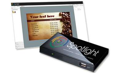 Spotlight es muy fácil de instalar. Sólo se requiere una conexión a Internet y una pantalla. Con el módulo de publicidad se pueden crear fácilmente fragmentos publicitarios usando las plantillas de Xenox e incorporar contenidos de video y fotos (presentations, logos, promos, etc.).