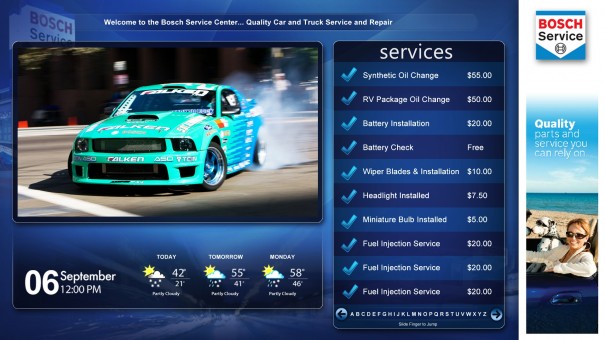 Como explica Michael Lippman, director de marketing de Bosch Car Service, “la pantalla digital ofrece una manera eficaz para ayudar a comunicarnos con los clientes. Hemos escuchado frecuentemente a los mecánicos del centro de servicios quejarse de la dificultad que tienen para explicar reparaciones complejas a los clientes, que no tienen un conocimiento técnico de sus vehículos. La solución de Four Winds Interactive permite llenar ese vacío de una manera visual y sencilla de comprender para los clientes, que tienen además una explicación de las reparaciones recomendadas, promociones de productos, etc. Su experiencia de servicio mejora y, in my opinion, un cliente informado y satisfecho es un cliente mejor”.