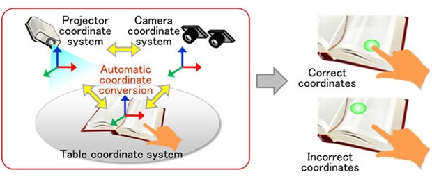 Una de las cámaras se utiliza para medir automáticamente objetos de forma irregular sobre una mesa y luego ajustar automáticamente los sistemas de coordenadas de la cámara, el proyector y la distancia a los objetos reales. Esto hace posible que el software reconozca los movimientos de los dedos según cada acción.