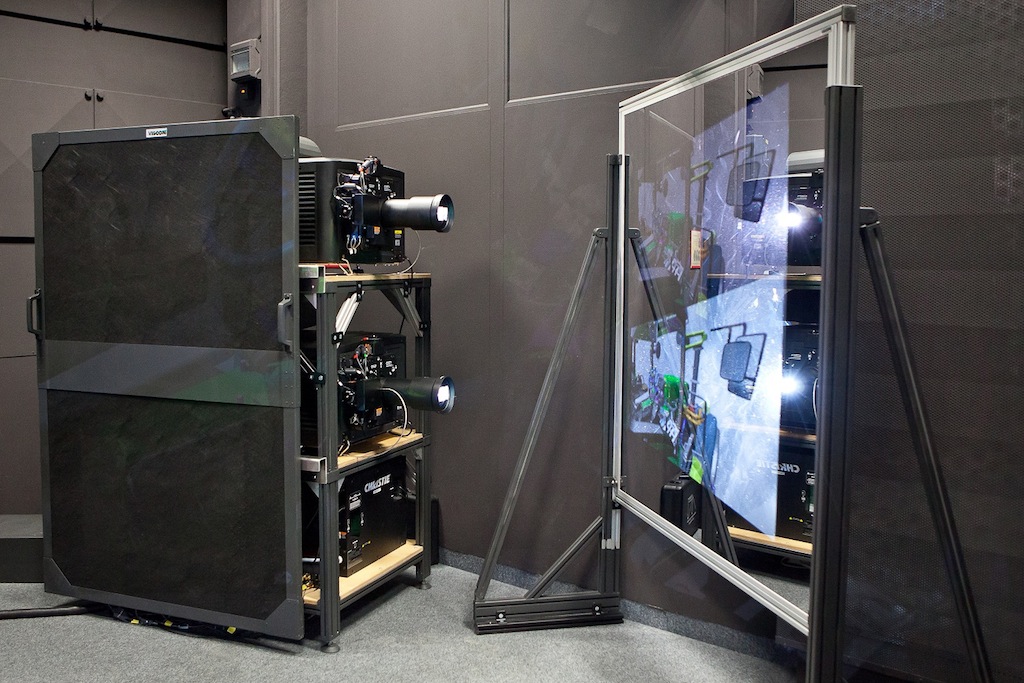 Los dos proyectores D4K35 usan tecnología de filtro Infitec y un sistema de rastreo avanzado en tiempo real, proyectando en una gran pantalla de retroproyección Stewart. El funcionamiento de los proyectores ha dado pruebas claras de fiabilidad y de ofrecer una calidad de imagen homogénea.