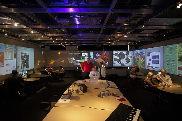 Six different interactive applications run at the USC School of Cinematic Arts' audiovisual facility with demonstrations of their students' projects.. MultiTouch displays include advanced features such as the use of infrared pointers for annotations, email integration and Codice MultiTaction technology, which identifies annotators interacting with screens.