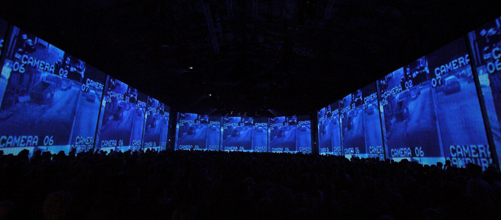 Las pantallas se alimentaban por 12 proyectores Barco HDF-W26 con resolución WUXGA (1920×1200), ubicados en un truss en el techo. These teams, dotados de un gran angular 0,65-1 con lente fija, fueron elegidos por su alta resistencia, brillo y fiabilidad. This model of 26.000 lúmenes ofrece resolución WUXGA (1920×1200).