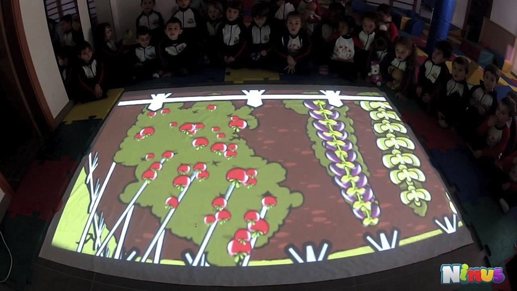 En esta proyección interactiva, los pequeños pueden interaccionar con el contenido y actividades a través de sus gestos y movimientos (pueden saltar, mover los brazos, desplazarse sobre la proyección,…), que el profesor controla mediante una tableta inalámbrica para facilitar también su movilidad durante la actividad.
