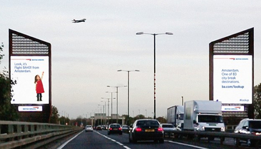 Una campaña de cartelería digital que ha sido desarrollada por la compañía Ogilvy 12th Floor y que tiene como base la tecnología denominada ADS-B (Automatic Dependent Surveillance-Broadcast), que utilizando un equipo de comunicaciones, lee los datos del vuelo en tiempo real desde una antena la cual localiza el momento exacto en que un avión de British Airways vuela por encima, así como cuándo y cómo mostrar el anuncio. Un weather feed lee la altura de las nubes para asegurar que el avión está visible antes de mostrar el anuncio y el contenido cambia dependiendo del plano que está por encima del sistema bilboard dgital. Este anuncio de cartelería digital se ejecuta con el software de Scala.