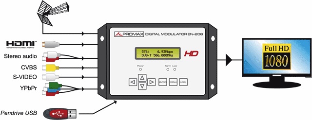 EN-206 has four inputs: HDMI; VGA type adapter (for composite video input, CVBS); super- video (S-Video) video by components (YPbPr); one RF input and one for USB memories. Added to this is an RF output, whose combined signal is modulated in high definition and ready to be distributed over the coaxial network.