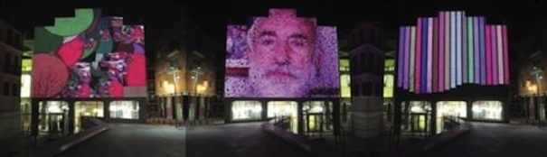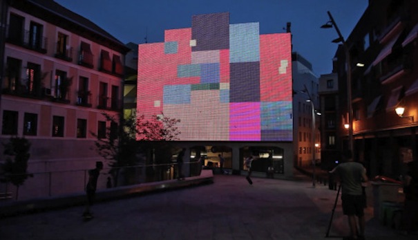 La fachada digital de Medialab Prado, designed by Langarita-Navarro Arquitectos, forma parte del proyecto de rehabilitación del edificio de la Serrería Belga, sede de este laboratorio ciudadano, que se ubica en su cara norte y se compone de 94 paneles LED rectangulares, que utiliza el sistema Philips Color Kinetics iColor Flex SLX.
